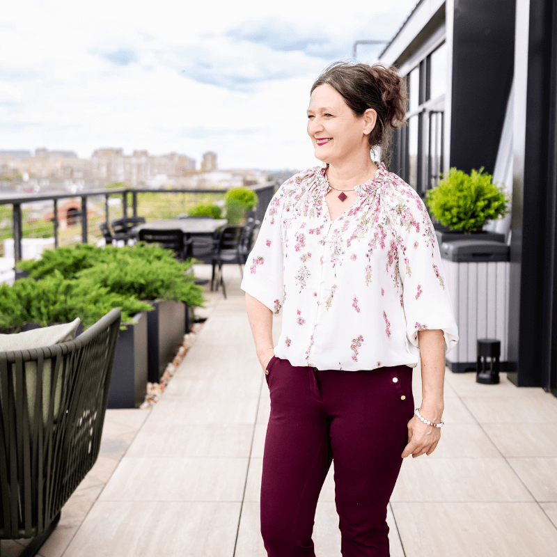 A woman with glasses in a red patterned turtleneck and black vest smiling at the camera