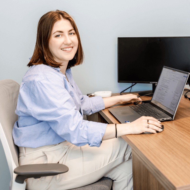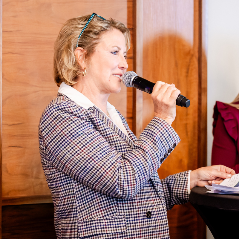 A professional woman in a gray blazer smiling at the camera